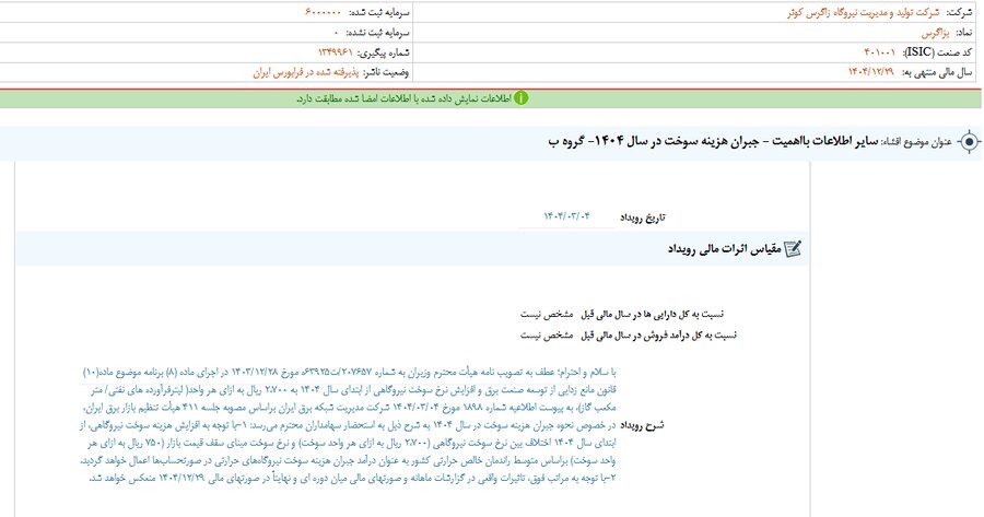 گزارش افشای اطلاعات بااهمیت - (سایر اطلاعات بااهمیت - جبران هزینه سوخت در سال ۱۴۰۴- گروه ب) منتهی به سال مالی ۱۴۰۴/۱۲/۲۹ بزاگرس منتشر شد.