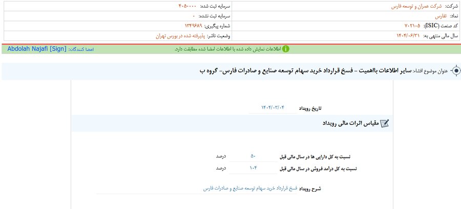 گزارش افشای اطلاعات بااهمیت - (سایر اطلاعات بااهمیت - فسخ قرارداد خرید سهام توسعه صنایع و صادرات فارس- گروه ب) منتهی به سال مالی ۱۴۰۴/۰۶/۳۱ ثفارس منتشر شد.