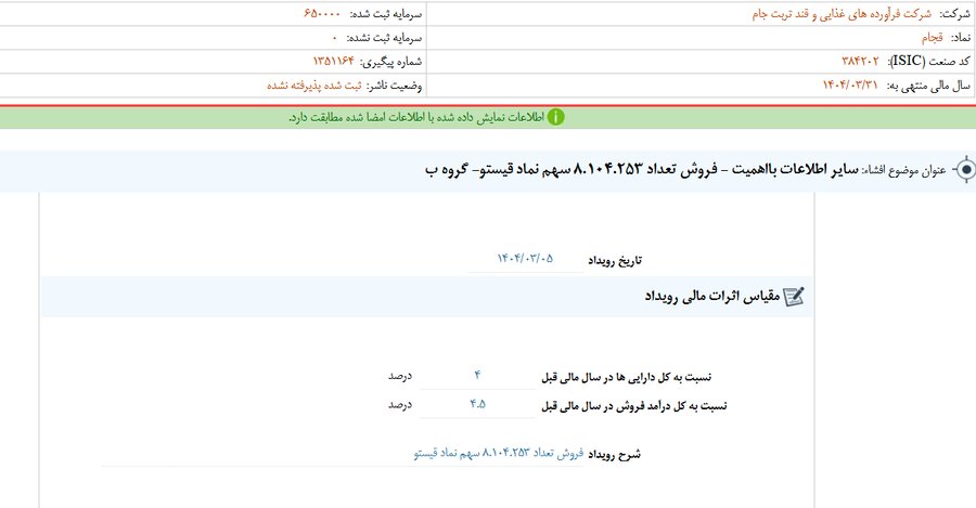 بر اساس انتشار گزارش افشای اطلاعات بااهمیت - (سایر اطلاعات بااهمیت - فروش تعداد ۸.۱۰۴.۲۵۳ سهم نماد قیستو- گروه ب) منتهی به سال مالی ۱۴۰۴/۰۳/۳۱ قجام مشخص شد،