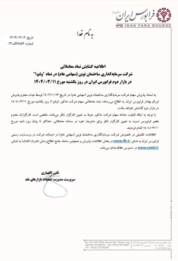 بر این اساس تاریخ گشایش نماد وثنو یکشنبه ۱۱ خردادماه ۱۴۰۴ و قابلیت معامله منوط به تعیین کارگزار ناظر است.