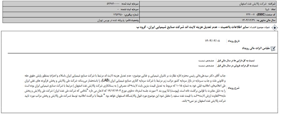 بر اساس انتشار گزارش افشای اطلاعات بااهمیت - (سایر اطلاعات بااهمیت - عدم تعدیل هزینه لایت اند شرکت صنایع شیمیایی ایران- گروه ب) منتهی به سال مالی ۱۴۰۴/۱۲/۲۹ شپنا مشخص شد.