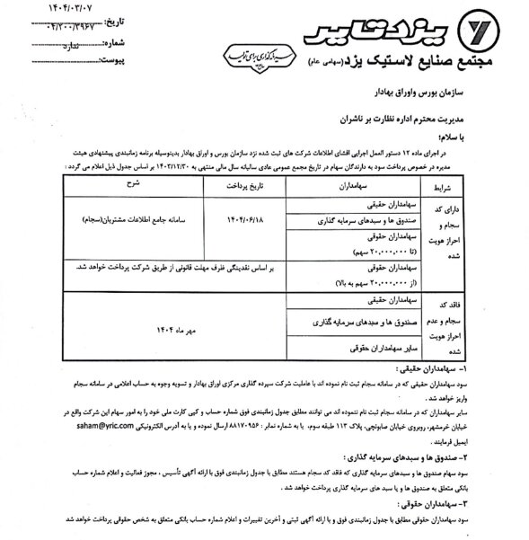 https://sedayebourse.ir/x6v53۹ خرداد ۱۴۰۴ - ۱۵:۰۹ کد خبر 525967 اخبار شرکتی کدالخوان ۹ خرداد ۱۴۰۴ - ۱۵:۰۹ پیزد چه وقت سود می دهد؟ زمانبندی پرداخت سود دوره ۱۲ ماهه منتهی به ۱۴۰۳/۱۲/۳۰ پیزد منتشر شد. به گزارش صدای بورس، مجتمع صنایع لاستیک یزد سود سهامداران حقیقی دارای کد سهام و احراز هویت شده را از ۱۴۰۴/۰۶/۱۸ پرداخت می کند. برنامه زمانبندی پیشنهادی هیات مدیره درخصوص پرداخت سود پیزد به داراندگان سهام در تاریخ مجمع عمومی عادی سالانه منتهی به ۱۴۰۳/۱۲/۳۰ به این شرح است؛ کد خبر 525967 برچسبها پیزد صدای بورس بازارسهام بازارسرمایه پرداخت سود سهام