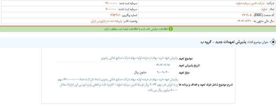 موضوع تعهد ؛ پذیرش تعهد خرید سهام در عرضه اولیه سهام شرکت صنایع غذایی رضوی و تاریخ پذیرش تعهد ۱۴۰۴/۰۳/۱۸ است.