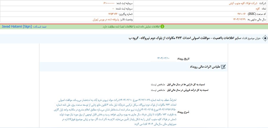 بر اساس انتشار گزارش افشای اطلاعات بااهمیت - (سایر اطلاعات بااهمیت - موافقت اصولی احداث ۲۷۳ مگاوات از بلوک دوم نیروگاه- گروه ب) منتهی به سال مالی ۱۴۰۴/۱۲/۲۹ کاوه مشخص شد.