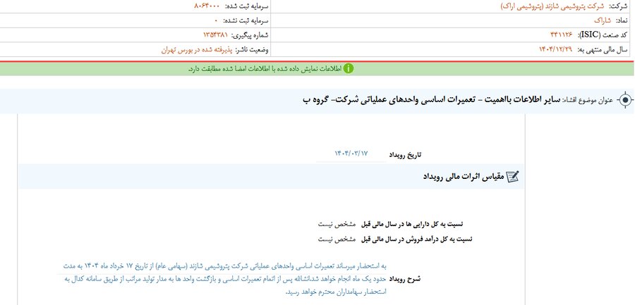 بر اساس انتشار گزارش افشای اطلاعات بااهمیت - (سایر اطلاعات بااهمیت - تعمیرات اساسی واحدهای عملیاتی شرکت- گروه ب) منتهی به سال مالی ۱۴۰۴/۱۲/۲۹ شاراک مشخص شد.