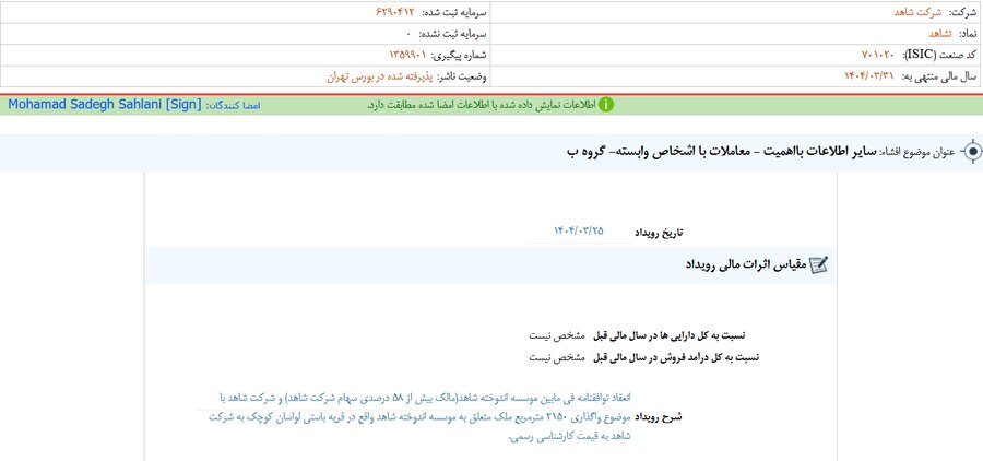 شرح رویداد؛ انعقاد توافقنامه فی مابین موسسه اندوخته شاهد(مالک بیش از ۵۸ درصدی سهام شرکت شاهد) و شرکت شاهد با موضوع واگذاری ۲۱۵۰ مترمربع ملک متعلق به موسسه اندوخته شاهد واقع در قریه باستی لواسان کوچک به شرکت شاهد به قیمت کارشناسی رسمی.