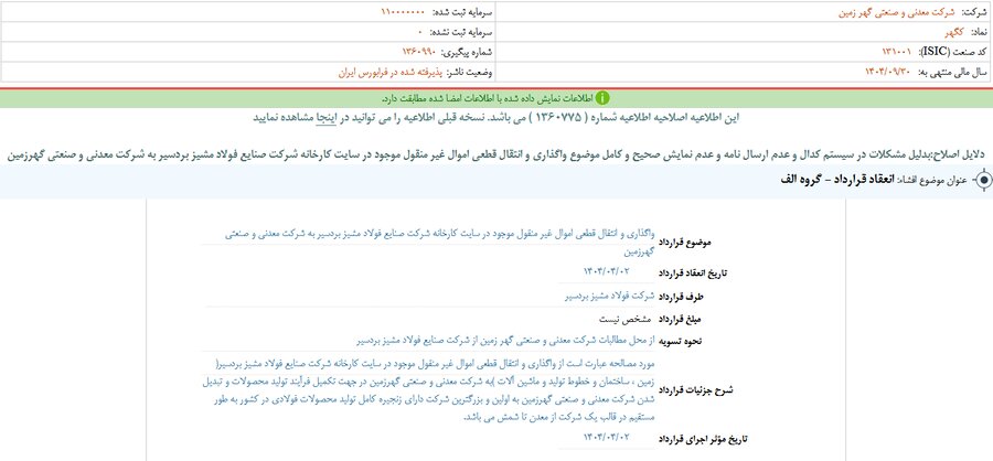 دلایل اصلاح؛ بدلیل مشکلات در سیستم کدال و عدم ارسال نامه و عدم نمایش صحیح و کامل موضوع واگذاری و انتقال قطعی اموال غیر منقول موجود در سایت کارخانه شرکت صنایع فولاد مشیز بردسیر به شرکت معدنی و صنعتی گهرزمین است.
