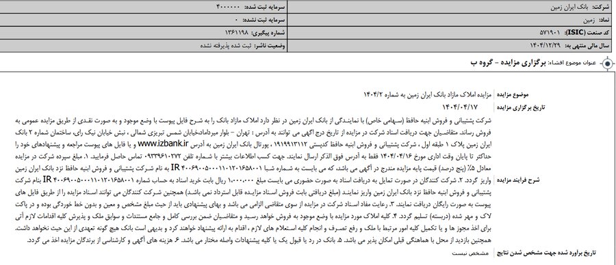 گزارش افشای اطلاعات بااهمیت - (برگزاری مزایده - گروه ب) منتهی به سال مالی ۱۴۰۴/۱۲/۲۹ وزمین منتشر شد.