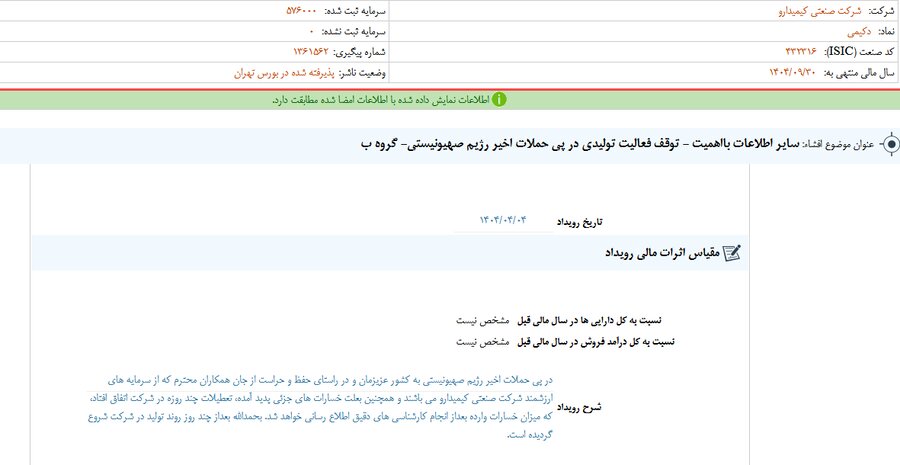گزارش افشای اطلاعات بااهمیت - (سایر اطلاعات بااهمیت - توقف فعالیت تولیدی در پی حملات اخیر رژیم صهیونیستی- گروه ب) منتهی به سال مالی ۱۴۰۴/۰۹/۳۰ دکیمی منتشر شد.