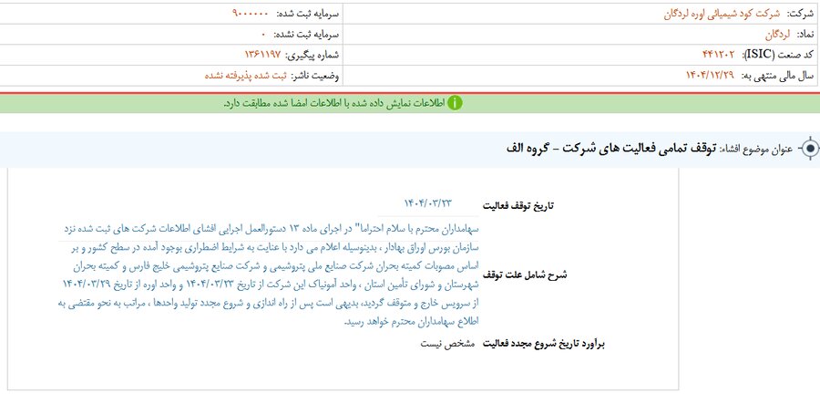 به گزارش صدای بورس، شرکت کود شیمیایی اوره لردگان از توقف تمامی فعالیت های شرکت در تاریخ ۱۴۰۴/۰۳/۲۳ خبر داد.