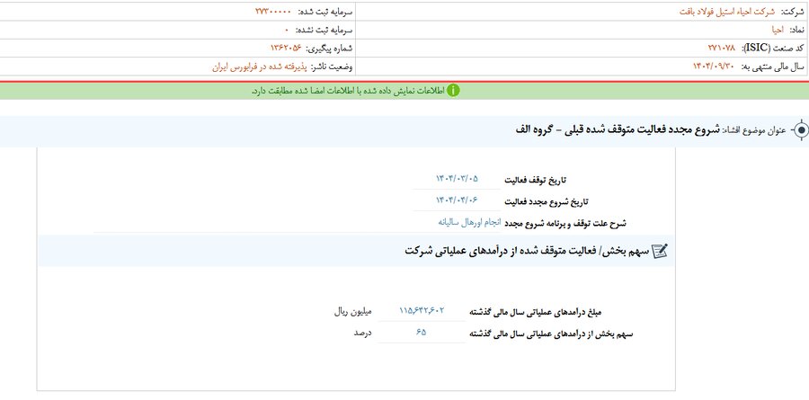 گزارش افشای اطلاعات بااهمیت - (شروع مجدد فعالیت متوقف شده قبلی - گروه الف) منتهی به سال مالی ۱۴۰۴/۰۹/۳۰ احیا منتشر شد.