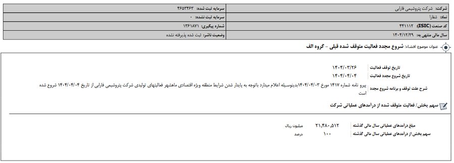 بر اساس انتشار گزارش افشای اطلاعات بااهمیت - (شروع مجدد فعالیت متوقف شده قبلی - گروه الف) منتهی به سال مالی ۱۴۰۴/۱۲/۲۹ شفارا مشخص شد.