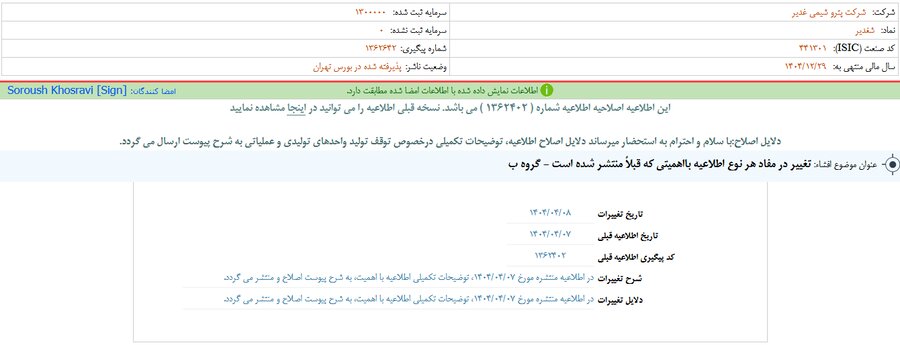 بر اساس انتشار گزارش افشای اطلاعات بااهمیت - (تغییر در مفاد هر نوع اطلاعیه بااهمیتی که قبلاً منتشر شده است - گروه ب) منتهی به سال مالی ۱۴۰۴/۱۲/۲۹(اصلاحیه) شغدیر مشخص شد.