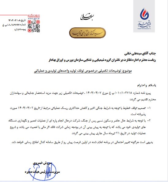 به استحضار میرساند دلایل اصلاح اطلاعیه، توضیحات تکمیلی درخصوص توقف تولید واحدهای تولیدی و عملیاتی ارسال شده است.