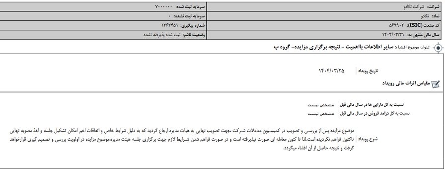 گزارش افشای اطلاعات بااهمیت - (سایر اطلاعات بااهمیت - نتیجه برگزاری مزایده- گروه ب) منتهی به سال مالی ۱۴۰۴/۰۳/۳۱(اصلاحیه) وکادو منتشر شد.