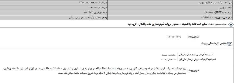 گزارش افشای اطلاعات بااهمیت - (سایر اطلاعات بااهمیت - صدور پروانه شهرسازی ملک بافکار- گروه ب) منتهی به سال مالی ۱۴۰۴/۰۹/۳۰ وبهمن منتشر شد.