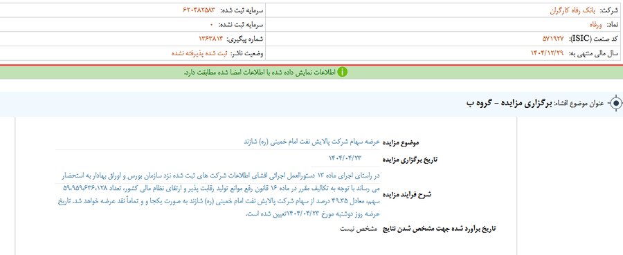 گزارش افشای اطلاعات بااهمیت - (برگزاری مزایده - گروه ب) منتهی به سال مالی ۱۴۰۴/۱۲/۲۹ ورفاه منتشر شد.