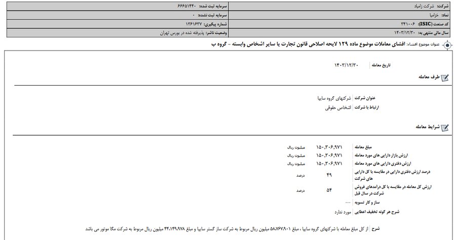 بر اساس انتشار گزارش افشای اطلاعات بااهمیت - (افشای معاملات موضوع ماده ۱۲۹ لایحه اصلاحی قانون تجارت یا سایر اشخاص وابسته - گروه ب) منتهی به سال مالی ۱۴۰۳/۱۲/۳۰ خزامیا منتشر شد.