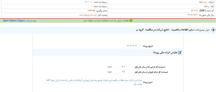بر اساس انتشار گزارش افشای اطلاعات بااهمیت - (سایر اطلاعات بااهمیت - نتایج شرکت در مناقصه- گروه ب) منتهی به سال مالی ۱۴۰۴/۱۲/۲۹ وحافظ مشخص شد.