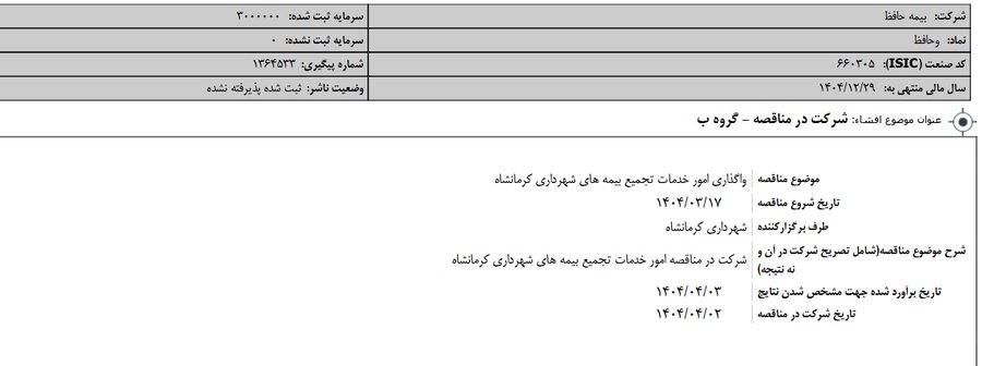 بر اساس انتشار گزارش افشای اطلاعات بااهمیت - (شرکت در مناقصه - گروه ب) منتهی به سال مالی ۱۴۰۴/۱۲/۲۹ وحافظ مشخص شد،