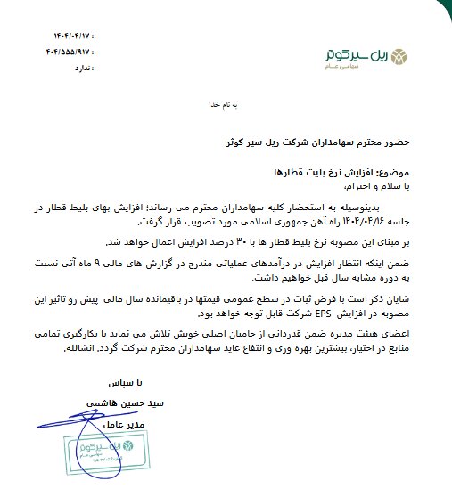 مصوبه اخیر راهآهن مبنی بر افزایش ۳۰ درصدی نرخ بلیت قطارها، نویدبخش افزایش قابل توجه درآمدهای عملیاتی و سود هر سهم (EPS) شرکت حسیر است. این تغییرات که از تاریخ ابلاغ لازمالاجرا خواهد بود، تاثیر مستقیمی بر وضعیت مالی این شرکت حملونقل ریلی خواهد داشت.