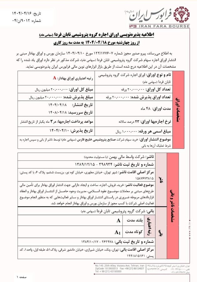 شرکت گروه پتروشیمی تابان فردا (سهامی عام) با انتشار اطلاعیه‌ای، اعلام کرد که اوراق اجاره سهام این شرکت از روز چهارشنبه، ۱۸ تیرماه، به مدت سه روز کاری در فرابورس ایران پذیره‌نویسی خواهد شد.