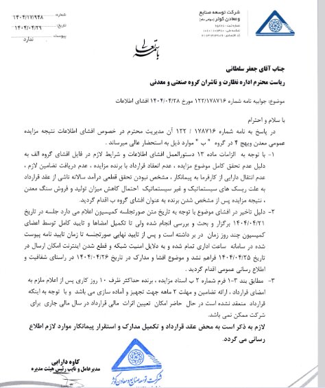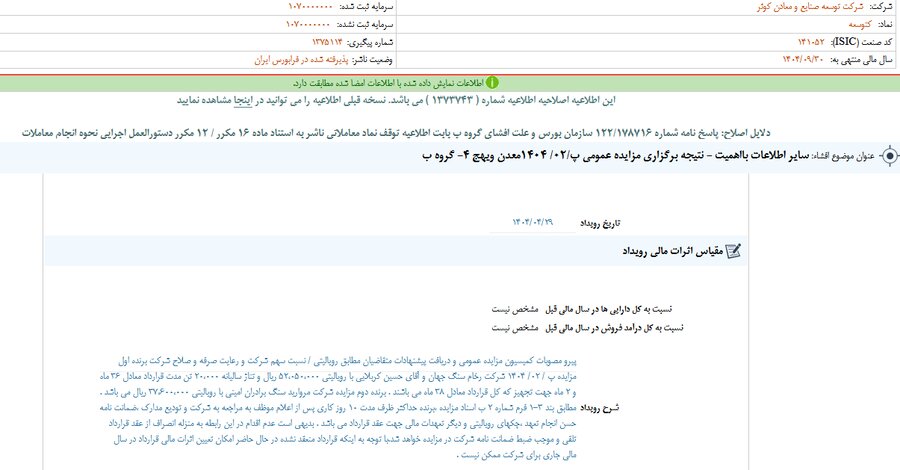 شرکت توسعه صنایع و معادن کوثر در اطلاعیه‌ای به تشریح جزئیات برگزاری مزایده عمومی و مذاکرات انجام شده پرداخته است.