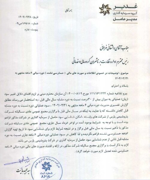 شرکت سرمایه‌گذاری غدیر با ارسال نامه‌ای به سازمان بورس، توضیحات مربوط به دلایل تغییر سود عملیاتی دوره میانی ۶ ماهه منتهی به ۱۴۰۴/۰۳/۳۱ را ارائه داد. این تغییرات در نسبت به دوره مشابه سال مالی قبل، ناشی از کاهش نسبت سود عملیاتی شرکت پتروشیمی پارس بوده است.