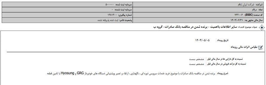 شرکت ایران ارقام اعلام کرد که در مناقصه بانک صادرات ایران برای ارائه خدمات دوره‌ای، نگهداری، ارتقاء، تعمیر و پشتیبانی دستگاه‌های خودپرداز GRG و Hyosung، برنده شده است. با این حال، جزئیات مربوط به مقیاس اثرات مالی این رویداد هنوز نامشخص است.