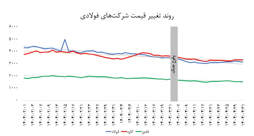 نمودار زیر روند تغییر قیمت شرکتهای فولاد مبارکه اصفهان، فولاد خوزستان و فولاد کاوه جنوب کیش به عنوان ۳ نماد بزرگ بورسی در گروه فولادی را نشان میدهد.