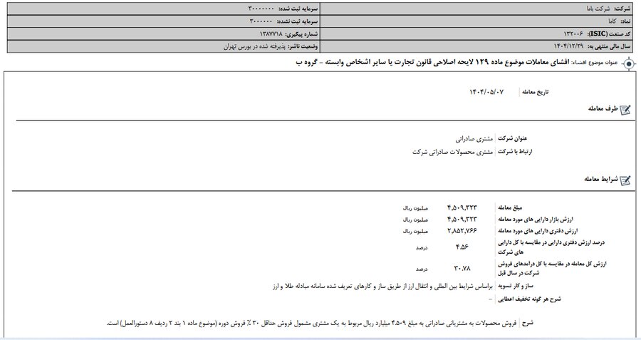 گزارش افشای اطلاعات بااهمیت گروه ب- (افشای معاملات موضوع ماده ۱۲۹ لایحه اصلاحی قانون تجارت یا سایر اشخاص وابسته) منتهی به سال مالی ۱۴۰۴/۱۲/۲۹(اصلاحیه) کاما منتشر شد.