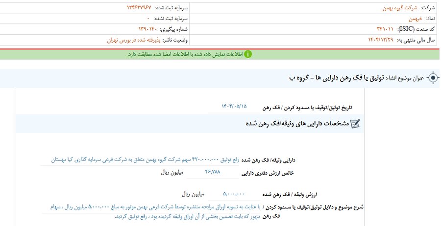 شرکت گروه بهمن ، از رفع توثیق ۴۲۰ میلیون سهم خود خبر داد. این سهام که متعلق به شرکت فرعی سرمایه‌گذاری کیا مهستان بوده و در تاریخ ۱۴۰۴/۰۵/۱۵ از وثیقه خارج شده است، در پی تسویه اوراق مرابحه بهمن موتور آزاد شد.