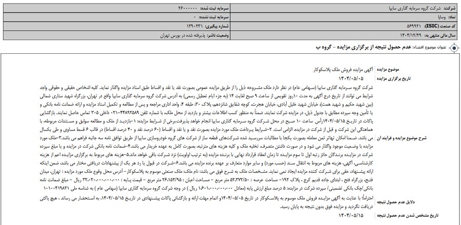 شرکت گروه سرمایه گذاری سایپا، از عدم حصول نتیجه در مزایده فروش ملک صنعتی خود موسوم به پلاسکوکار خبر داد. با وجود آگهی عمومی و تعیین مهلت برای ارائه پیشنهادات تا تاریخ ۱۴۰۴/۰۵/۱۵، هیچ پاکت پیشنهادی دریافت نشده و این مزایده بدون نتیجه پایان یافت.