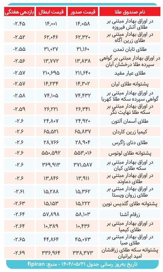 https://media.sedayebourse.ir/d/2025/08/12/4/1075928.jpg?ts=1755028133000به گزارش صدای بورس، بازدهی ۲۰ صندوق طلا در هفته گذشته مورد بررسی قرار گرفت که در جدول زیر آمده است.