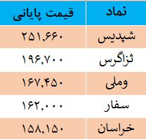 جدول زیر قیمت پایانی این سهمها را در آخرین روز معاملاتی گذشته نشان میدهد. (ارقام به ریال است.)