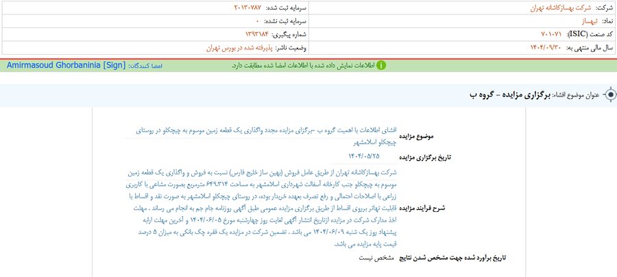 شرکت بهسازکاشانه تهران، با نماد ثبهساز ، در راستای سیاست‌های خود اقدام به برگزاری مزایده‌ای برای واگذاری یک قطعه زمین بااهمیت کرده است. این مزایده که ذیل افشای اطلاعات بااهمیت گروه ب قرار می‌گیرد، مربوط به زمین موسوم به چیچکلو واقع در روستای چیچکلو اسلامشهر است.