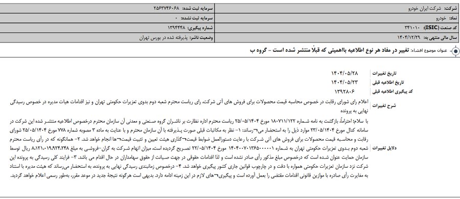 به گزارش صدای بورس، شرکت ایران خودرو از تغییراتی در مفاد اطلاعیه قبلی خود خبر داد، این تغییرات مربوط به اعلام رأی شورای رقابت در خصوص محاسبه قیمت محصولات آتی و همچنین پیگیری‌های نهایی در پرونده گران‌فروشی این شرکت است.