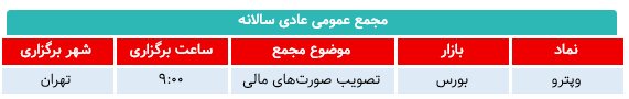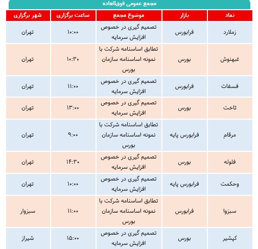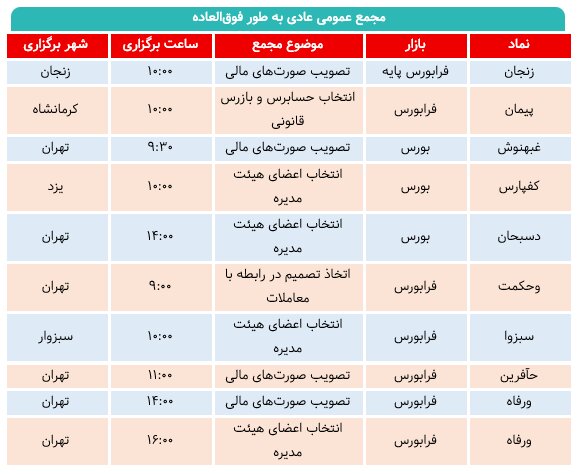 جدول زیر به منظور تفکیک مجامع شرکت‌ها و موضوع مورد بحث در آن‌ها تهیه شده است. این جدول به سهام‌داران و علاقه‌مندان به بازار سرمایه کمک می‌کند تا به‌طور دقیق‌تر از برنامه‌ها و موضوعات مطرح‌شده در این مجامع آگاه شوند.