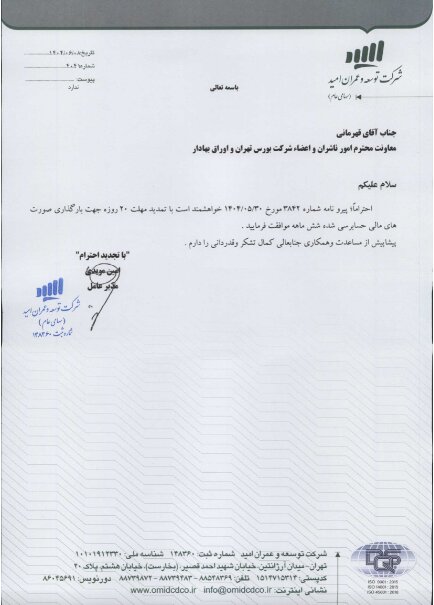 شرکت توسعه و عمران امید (ثامید) اعلام کرد که مهلت تعیین‌شده برای رعایت دستورالعمل پذیرش اوراق بهادار از سوی شرکت بورس اوراق بهادار تهران، به مدت ۱۰ روز دیگر تمدید شده است.