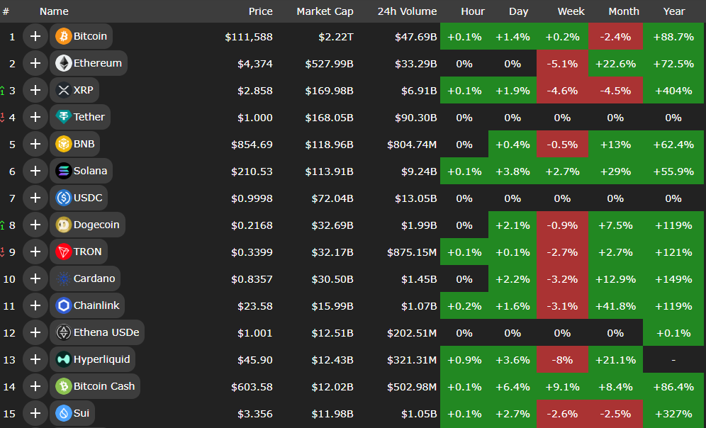در جدول زیر، عملکرد ۱۵ رمزارز برتر بازار کریپتوکارنسی را مشاهده میکنید.