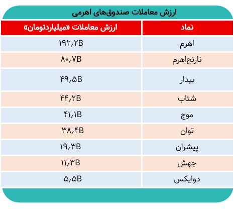 در میان نمادهای صندوق‌های اهرمی، بیشترین حجم معاملات به صندوق اهرم با بیش از ۹۹ میلیون واحد تعلق داشت. پس از آن، نارنج اهرم بیش از ۶۲ میلیون و بیدار بیش از ۴۱ میلیون حجم داشتند. از نظر ارزش معاملات، صندوق اهرم با بیش از ۱۹۲ میلیارد تومان در صدر قرار گرفت، نارنج اهرم بیش از ۸۰ میلیارد تومان و بیدار بیش از ۴۹ میلیارد تومان ثبت کردند.