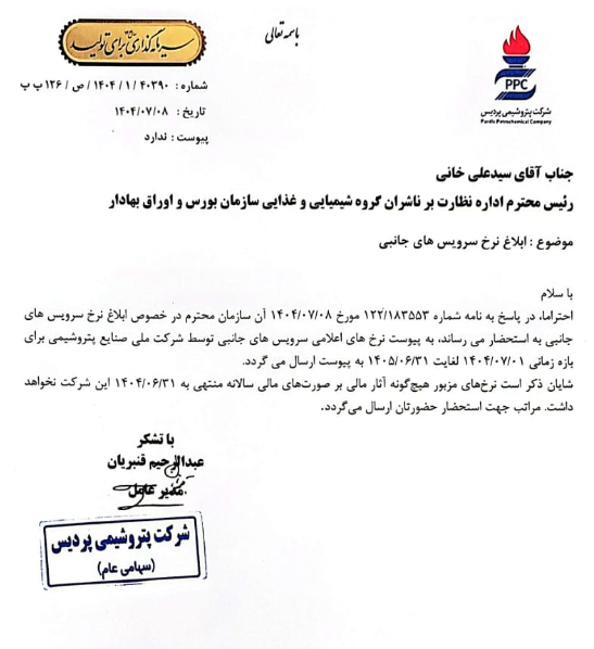 این شرکت در پاسخ به نامه روز ۸ مهر ۱۴۰۴ سازمان بورس اعلام کرد که شرکت ملی صنایع پتروشیمی نرخهای جدید سرویسهای جانبی را برای بازه زمانی ۱ مهر ۱۴۰۴ تا ۳۱ شهریور ۱۴۰۵ ابلاغ کرده است. نرخهای مذکور بهصورت رسمی به پتروشیمی پردیس اعلام و جهت اطلاع سهامداران ارسال شدهاند.