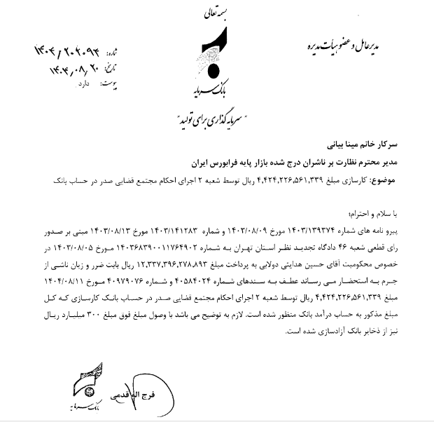 بانک سرمایه اعلام کرد بخشی از محکومیت مالی مربوط به پرونده حسین هدایتی دولابی به مبلغ ۴ هزار و ۴۲۴ میلیارد و ۲۶۶ میلیون و ۵۶۱ هزار و ۳۳۹ ریال به حساب درآمد بانک واریز شده است. این مبلغ براساس سندهای رسمی مورخ ۱۱ آبان ۱۴۰۴ و از طریق شعبه ۲ اجرای احکام مجتمع قضایی صدر وصول شده است.