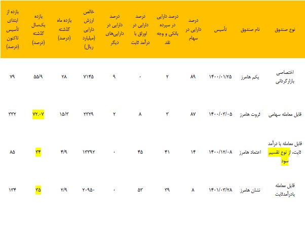 در جدول زیر مشروح عملکرد صندوق های سرمایه گذاری تحت مدیریت شرکت سبدگردان هامرز را مشاهده می کنید.