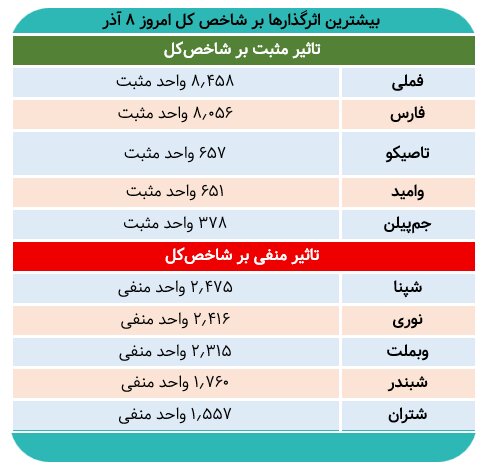 با این حال، در سمت مثبت نمادهایی حضور داشتند که تلاش کردند بخشی از افت شاخص را جبران کنند. از میان آنها میتوان به فمیلی، فارس، تاصیکو، وامید و جمپیلن اشاره کرد که بیشترین اثر مثبت را بر شاخص داشتند و تا حدودی از شدت ریزش جلوگیری کردند.