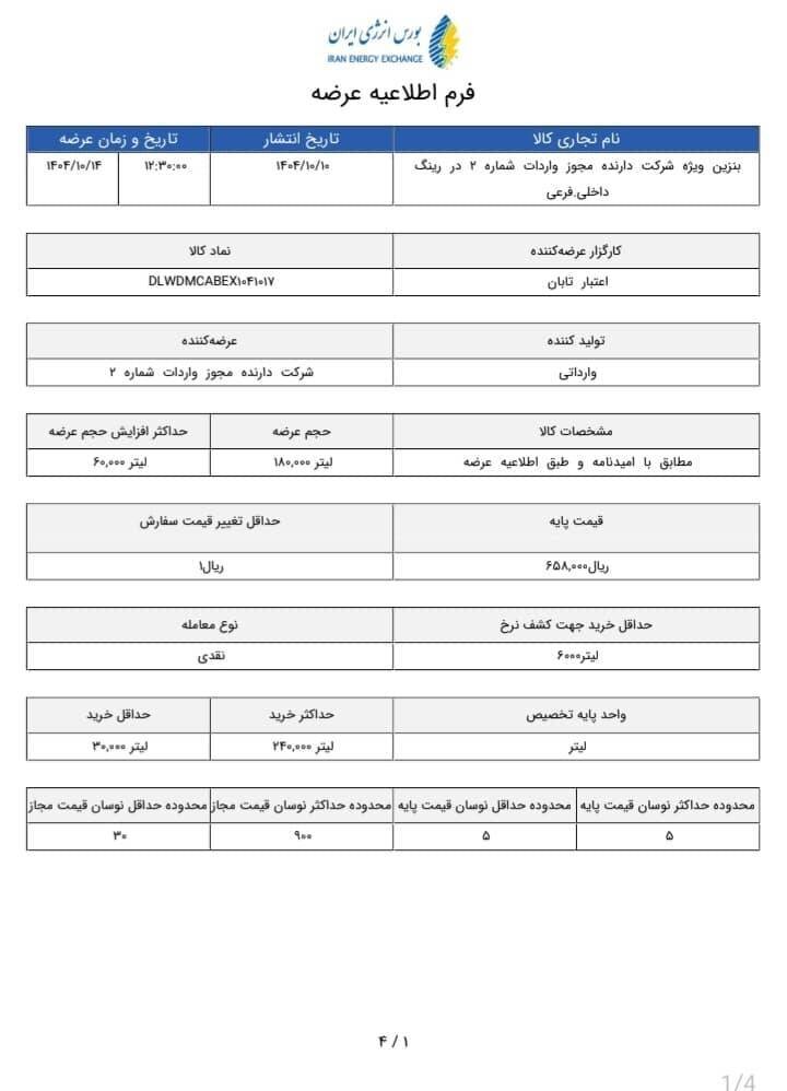 به گزارش صدای بورس؛ اطلاعیه عرضه بنزین ویژه وارداتی توسط بورس انرژی نشان میدهد، اطلاعیه عرضه جدید تغییر کرده و قیمت ۶۹۵۰۰ تومان به ازای هر لیتر به همان قیمت قبلی یعنی ۶۵۸۰۰ بازگشته است. البته حجم عرضه نیز حدود ۴۰ درصد کاهش یافته و حداکثر خرید نیز کاهش و حداقل خرید افزایش داشته است. تاریخ عرضه برای روز یکشنبه ۱۴ دی ماه قید شده است.