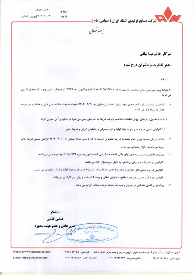 شرکت صنایع تولیدی اشتاد ایران در پایان تأکید کرده است که نوسان سود و زیان دوره منتهی به ۳۰ آذر ۱۴۰۴ نسبت به دوره مشابه سال قبل به‌طور کامل در قالب این توضیحات و نامه تشریح شده و اطلاعات لازم در اختیار سهامداران قرار گرفته است.